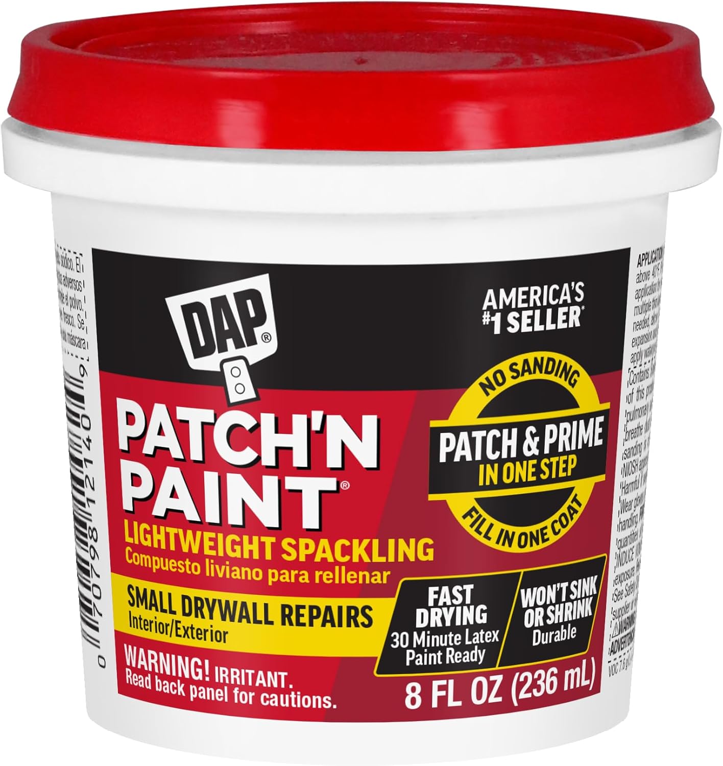DAP Patch-N-Paint Lightweight Spackling is the ultimate wall repair solution for smooth, professional-looking results. This premium-grade compound quickly fills small holes, dents, and cracks in drywall, plaster, and wood surfaces. The lightweight formula spreads easily, adheres strongly, and dries fast without shrinking or cracking, allowing you to paint in as little as one hour. Once cured, it sands effortlessly to a fine, smooth finish that perfectly matches the surrounding wall. Ideal for both professionals and DIY enthusiasts, Patch-N-Paint makes repairing nail holes and surface imperfections simple, clean, and reliable. Its ready-to-use container eliminates mixing and waste, ensuring convenient, one-step application for any project. Whether you’re repainting a room, touching up old surfaces, or preparing walls for a new finish, this spackling paste delivers lasting performance, superior adhesion, and an ultra-smooth base coat. Trusted by painters nationwide, DAP Patch-N-Paint Lightweight Spackling is your go-to choice for seamless wall repair and perfect paint finishes.